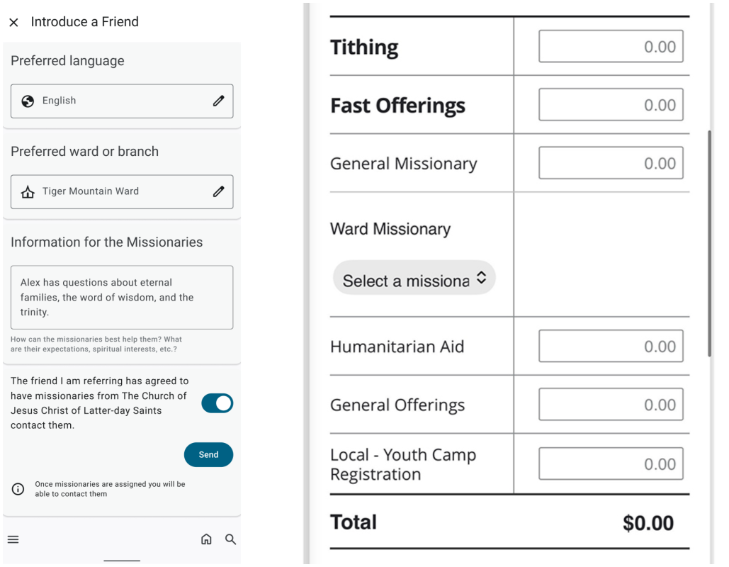 Ahora, al utilizar la función “Presentar amigos a los misioneros” dentro de la aplicación, los miembros pueden seleccionar un barrio o una rama concreta cuando envíen el formulario (véase el lado izquierdo de la imagen que se muestra a continuación).