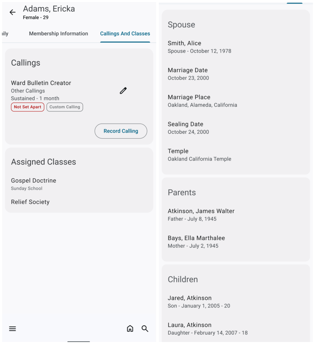 Ahora, los líderes de estaca y de barrio pueden registrar y actualizar los llamamientos de los miembros directamente en la aplicación Herramientas para miembros (véase el lado izquierdo de la imagen que se muestra a continuación). Anteriormente esos cambios tenían que hacerse a través de Fuentes de recursos para líderes y secretarios en el sitio web de la Iglesia. Ahora, los líderes pueden administrar los llamamientos al momento, lo que permite que los miembros accedan a herramientas y recursos para su nuevo llamamiento solo veinticuatro horas después.