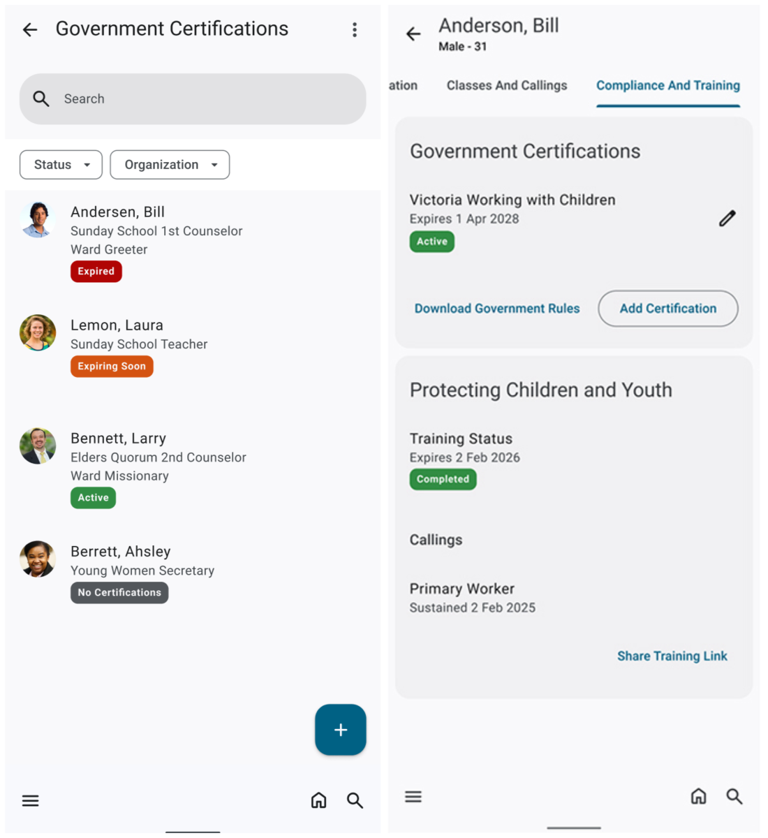 La nueva sección “Cumplimiento y capacitación” en los perfiles de los miembros permite a obispados, presidencias de estaca y secretarios ver y registrar las certificaciones gubernamentales de las personas que trabajan con niños y jóvenes.