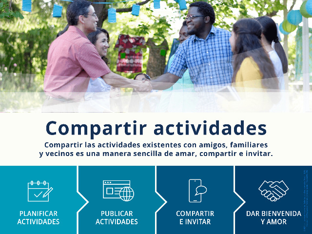 A través de “Compartir actividades”, los miembros pueden ir directamente a la página de su barrio para crear, ver y compartir eventos públicos con amigos. Los eventos publicados en las páginas de barrio están optimizados para compartirse y también pueden aparecer en plataformas como Eventbrite, lo que ayuda a más personas a descubrir eventos públicos organizados por barrios y ramas locales.