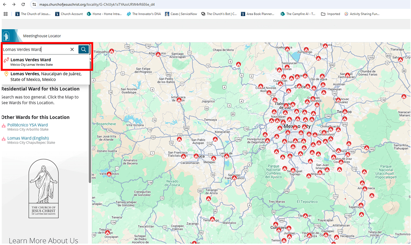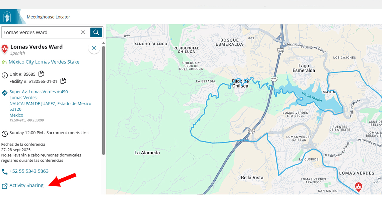 Para verificar si la página web de tu barrio y los recursos de Compartir actividades están disponibles, ve al Localizador de centros de reuniones de la Iglesia y escribe el nombre de tu barrio en el cuadro de búsqueda.