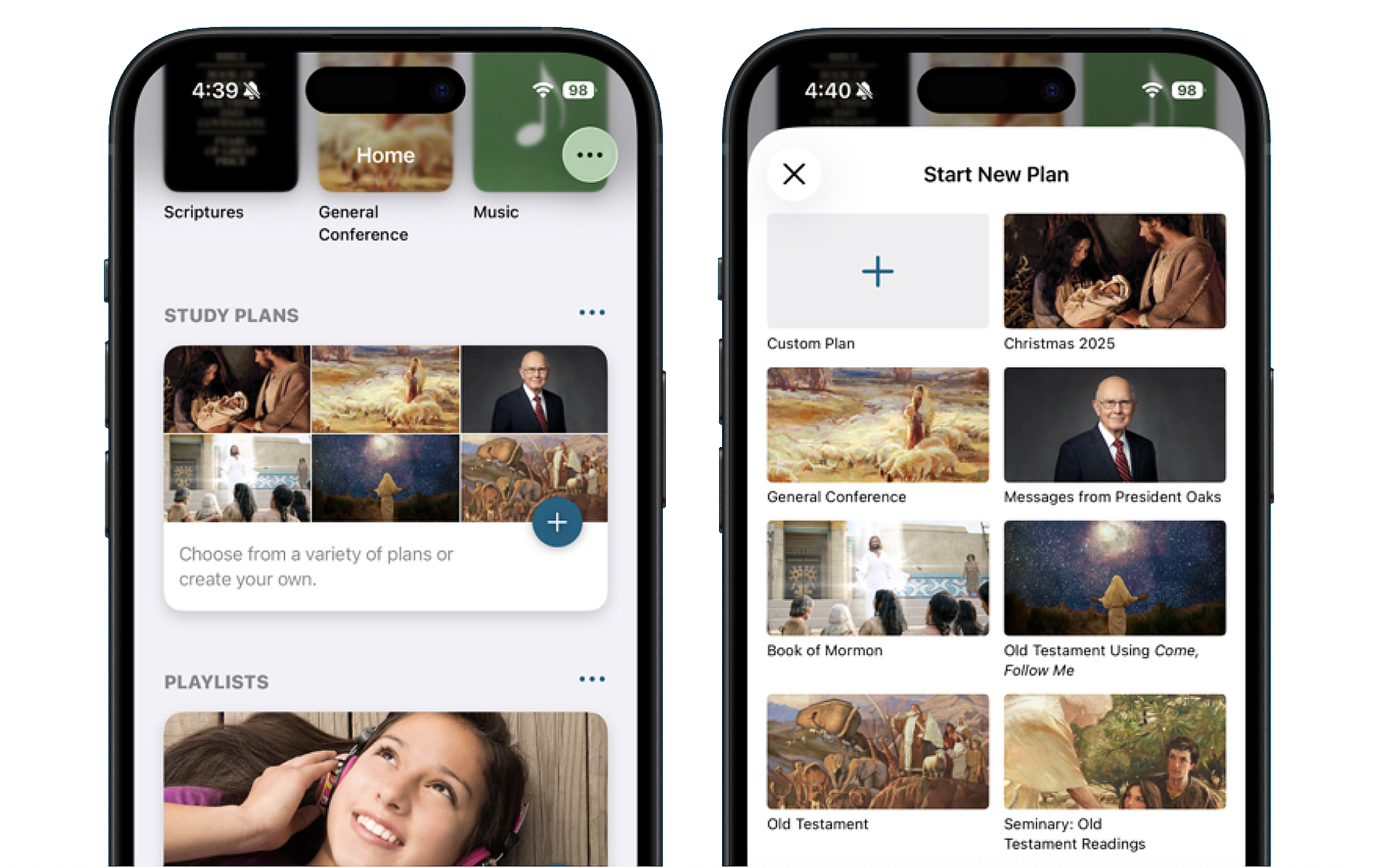 - Planes de estudio: Los planes de estudio de la Biblioteca del Evangelio ayudan a los usuarios a planificar el estudio de cualquier contenido de la aplicación. Además de crear planes personalizados, los miembros pueden utilizar tres planes proporcionados por la Iglesia que apoyan el estudio del Antiguo Testamento:
